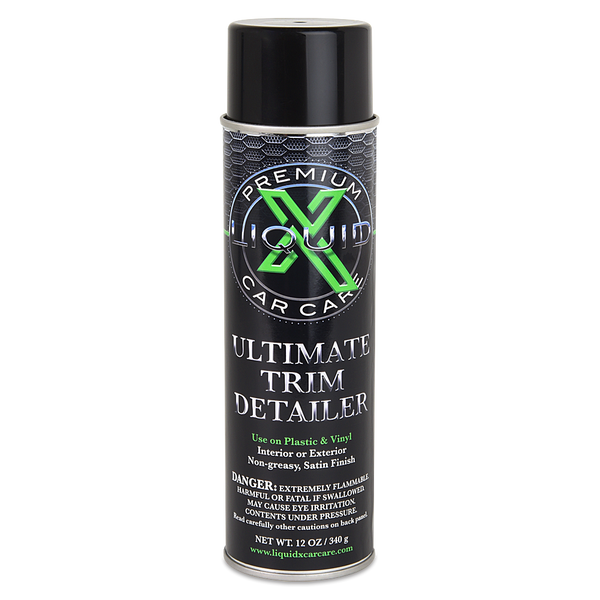 Liquid X Ultimate Trim Detailer is an everyday essential to restore faded or dull surfaces. This formula has been specifically created to regain the deep rich color, without leaving a greasy finish. Our amazing smelling aerosol sprays directly onto the surface for a satin finish, that doesn't even need to be wiped away! It's especially great for hard to reach areas, as the pressure pushes the product into difficult cracks and crevices that you normally wouldn't be able to clean by hand. Not only does it enhance the look of your trim, but it also adds UV protection to help eliminate premature fading and cracking. Great for use on any interior or exterior surfaces including tires, vents, dashboards, trim, engine bays, and so much more! Regain the brand new look your car desires and let it bring back the brilliance that you commonly lose on black trim.